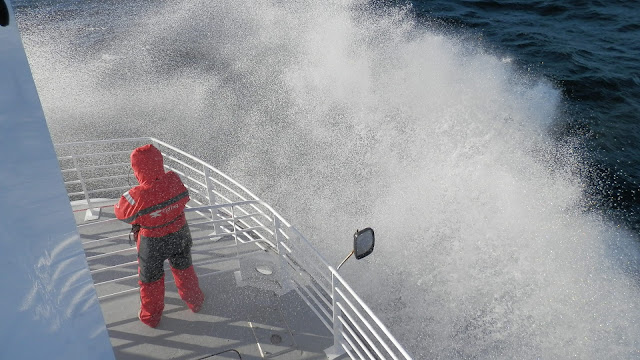 So, we got to the boat on the south shore and everybody got on board. As soon as we got going, they explained the safety rules and also said that we might be warmer and more comfortable with one of the "overalls" they had available for us to wear. It can get pretty cold out there, even though it was a bright sunny day. The temperature was about 10C (50F), but it was still really windy. I figured I was okay with what I had on, but Ruth decided to put on the suit they offered.